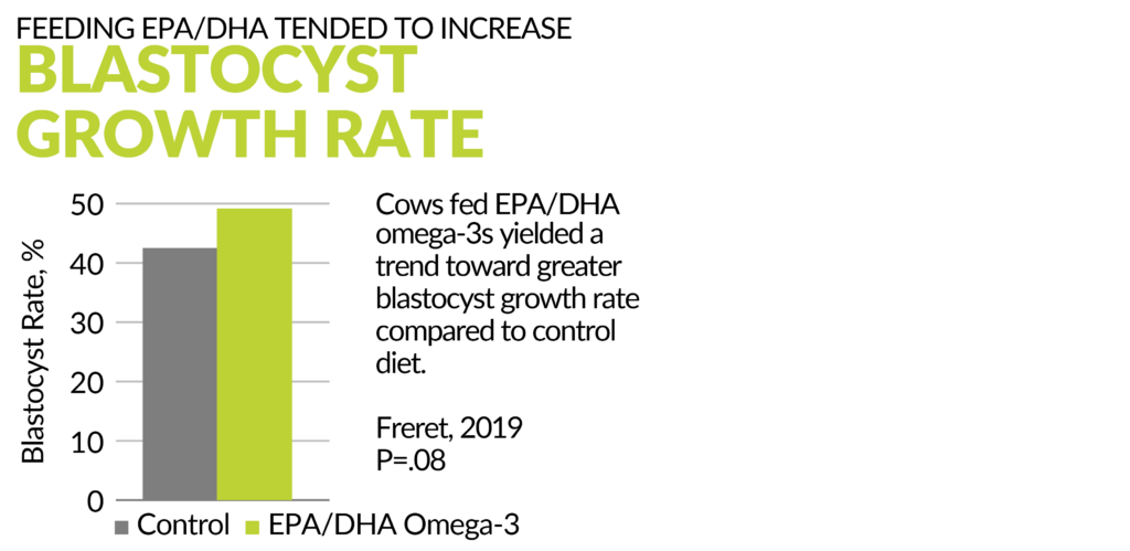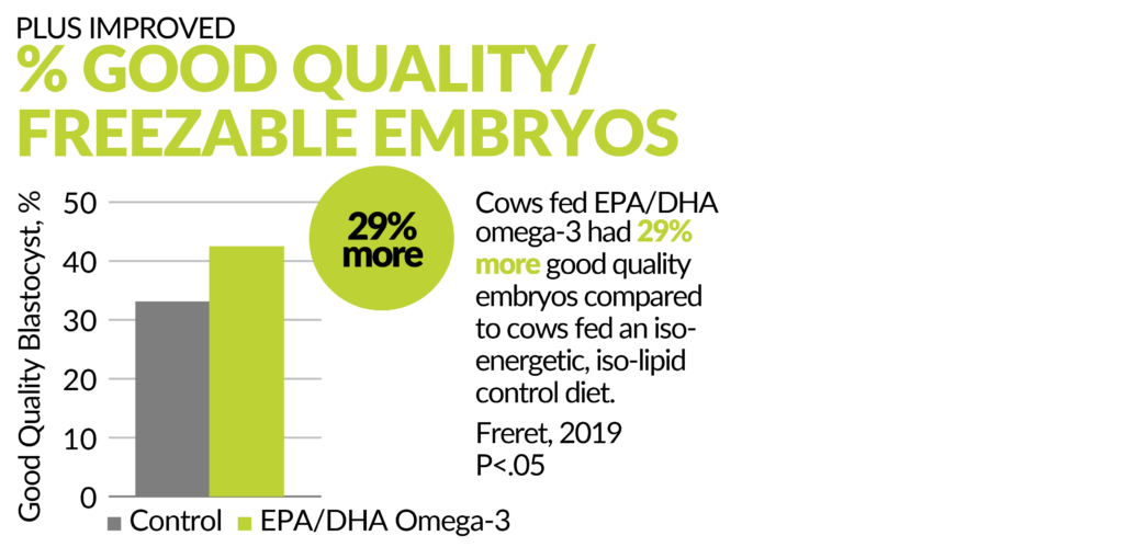 امگا ۳ EPA/DHA) (یک ماده مغذی ضروری است که در بسیاری از عملکردهای بیولوژیکی اساسی، از جمله رشد جنین، سیگنالینگ سلولی، تنظیم ایمنی و استفاده از انرژی، نقش بسزایی دارد. در حالی که تحقیقات در مورد تأثیر آن به عنوان یک درمان احتمالی برای از دست دادن زودهنگام جنین در گاوهای شیری در اوایل دهه ۸۰ آغاز شد، کارهای جدیدتر بر درک مکانیسمهایی که امگا ۳ در فرآیند رشد جنین نقش دارند، متمرکز شدهاند. این دادههای جدید پیامدهای قوی به ویژه برای بهبود نتایج IVF دارد و البته به همان اندازه در مورد جنینهای در حال رشد بارداریهای معمولی نیز صدق میکند. بیایید به چند مطالعه اخیر که از مزایای آن برای گاوهای اهداکننده پشتیبانی میکنند – بهبود کیفیت جنین، سرعت رشد جنین و تعداد جنینهای زنده در هر OPU – نگاهی بیندازیم.