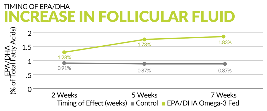 یکی دیگر از یافتههای مهم ، اندازهگیری زمان جذب امگا ۳ EPA/DHA) ( از رژیم غذایی به پلاسما و بافت فولیکولی بود. در حالی که سطوح در بافت در مقایسه با گاوهای کنترل در اندازهگیری دو هفتهای از قبل بالا بود، آنها تا هفته پنجم به سطح قابل توجهی بالاتر ادامه دادند و تا هفته هفتم به سطح ثابتی رسیدند (شکل 4). این کمیسازی میزان انتقال پودر چربی حاوی امگا ۳ EPA/DHA) ( به بافتها به پاسخ به این سوال که آیا ما میتوانیم این اسیدهای چرب را حتی با وجود چالش بیوهیدروژناسیون شکمبه به روده کوچک منتقل کنیم، کمک میکند. این زمانبندی جذب همچنین به ما در مورد مدت زمان مورد نیاز برای تغذیه پودر چربی حاوی امگا ۳ EPA/DHA) (قبل از تأثیر قابل توجه بر رشد و کیفیت جنین کمک میکند… این یک لذت آنی نیست!